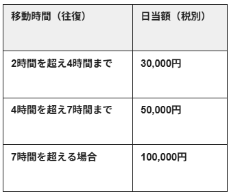 弁護士が委任事務処理のために事務所所在地を離れ、移動によってその事件等のために拘束されることの対価として、以下の日当を申し受けます。なお、支払時期については、着手金・報酬金と同じものとします。